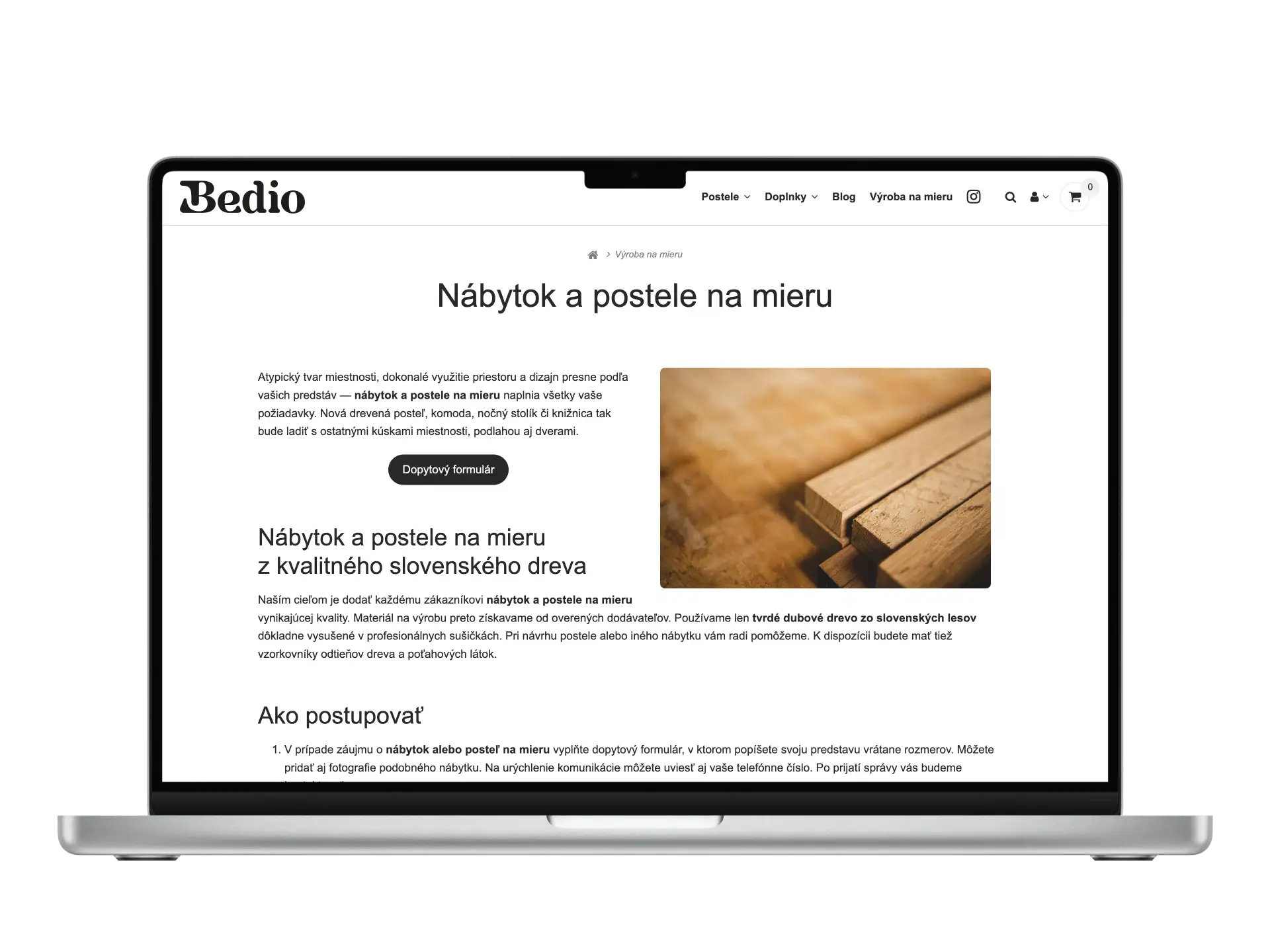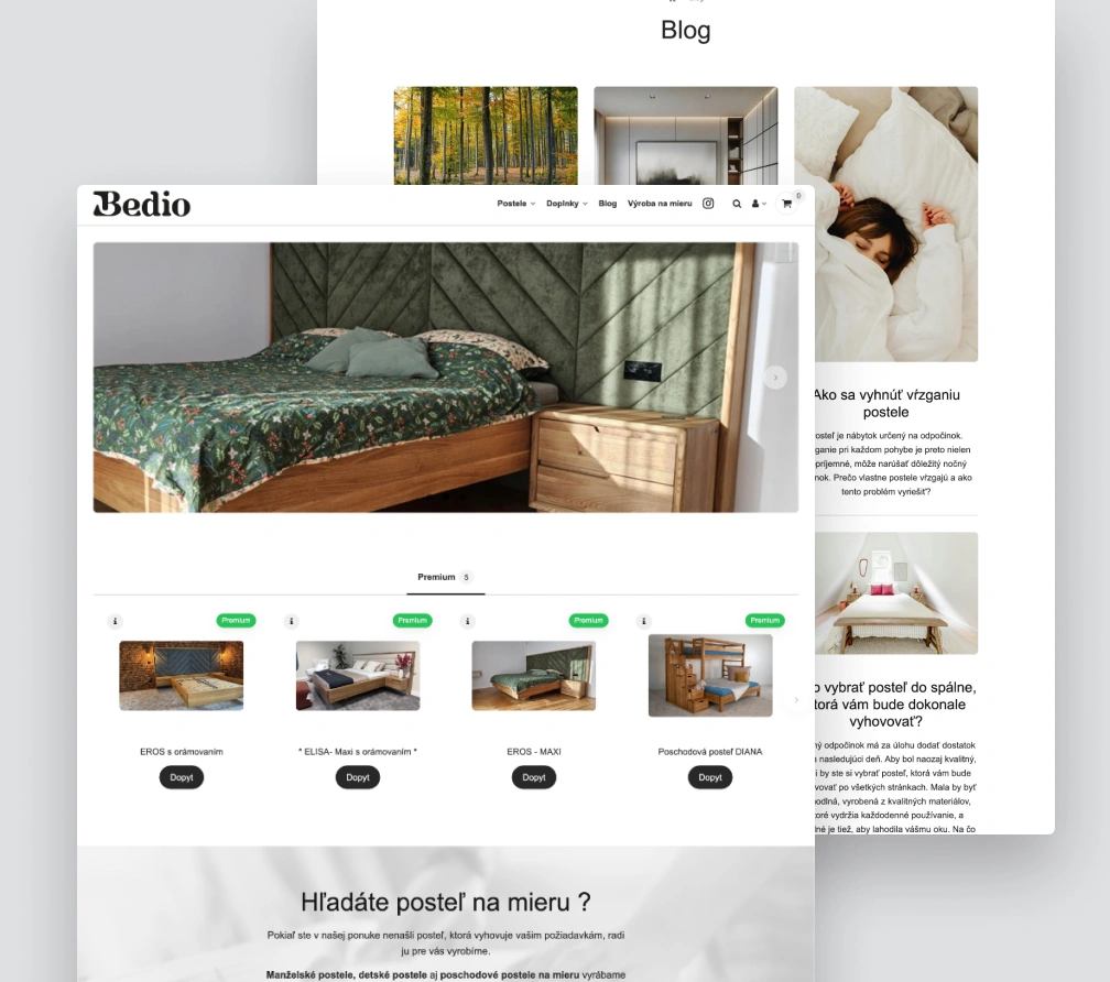 Bedio, výrobca spálňového nábytku na mieru, potreboval plne funkčný a moderný e-shop na predaj svojich produktov – od postelí a nábytku na mieru až po doplnky ako matrace, rošty či vankúše. Projekt bol špecifický tým, že klient už mal hotový dizajn a hľadal spoľahlivého partnera, ktorý sa postará o jeho technickú realizáciu. Našou úlohou bolo nielen vytvoriť funkčnú platformu, ale tiež pridať praktické riešenia, ktoré zákazníkom zjednodušia nákup a klientovi uľahčia správu obchodu.