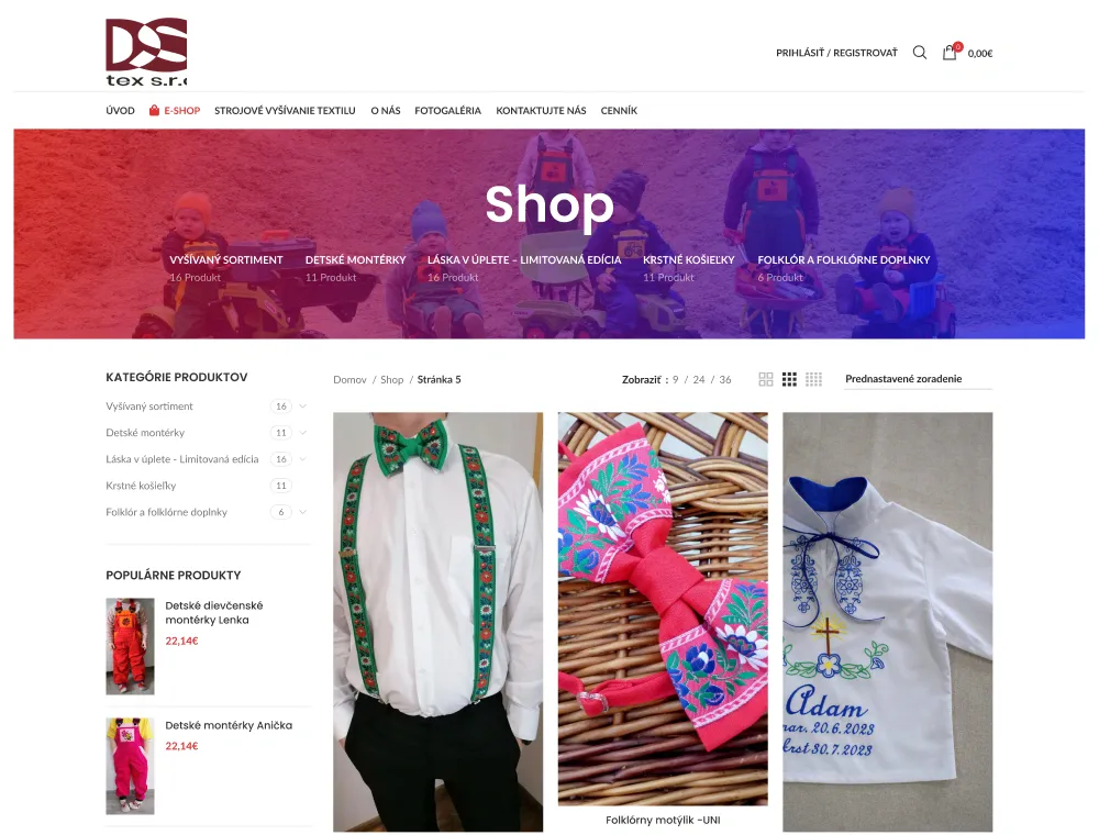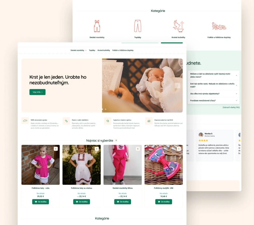 - Prehľadné kategórie produktov (napr. krstné košieľky, detské monterky, folklórne odevy).
