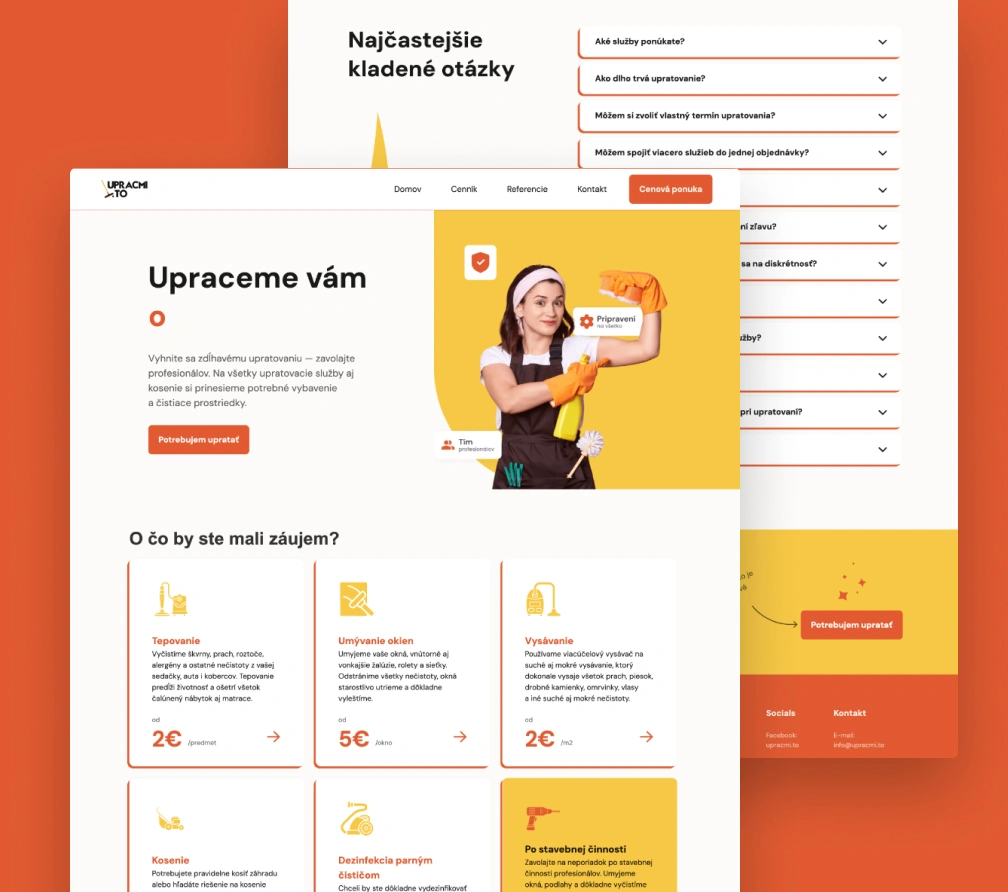 Upracmi To, úplne nová firma na trhu, sa zameriava na upratovacie služby pre domácnosti, autá a podujatia. Zakladateľ prišiel s jasnou víziou: “Ak má človek poriadok okolo seba, má poriadok aj v živote.” Ako ich partneri sme im pomohli premeniť túto víziu na realitu – od návrhu značky, tvorby identity až po moderný web s funkciami, ktoré šetria čas zákazníkom a prezentujú služby zrozumiteľne a atraktívne.