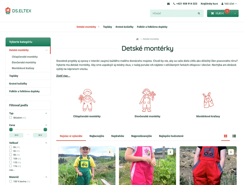 - Prehľadné kategórie produktov (napr. krstné košieľky, detské monterky, folklórne odevy).